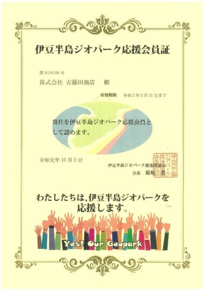 株式会社古藤田商店は2019年10月9日付で伊豆半島ジオパーク応援会員となりました。